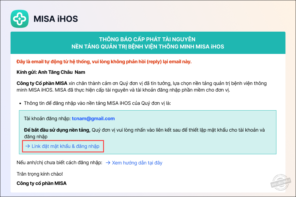 1. Sau khi đăng ký sử dụng nền tảng quản trị bệnh viện MISA iHOS, đơn vị nhận được email do MISA gửi thông báo cấp phát tài nguyên.