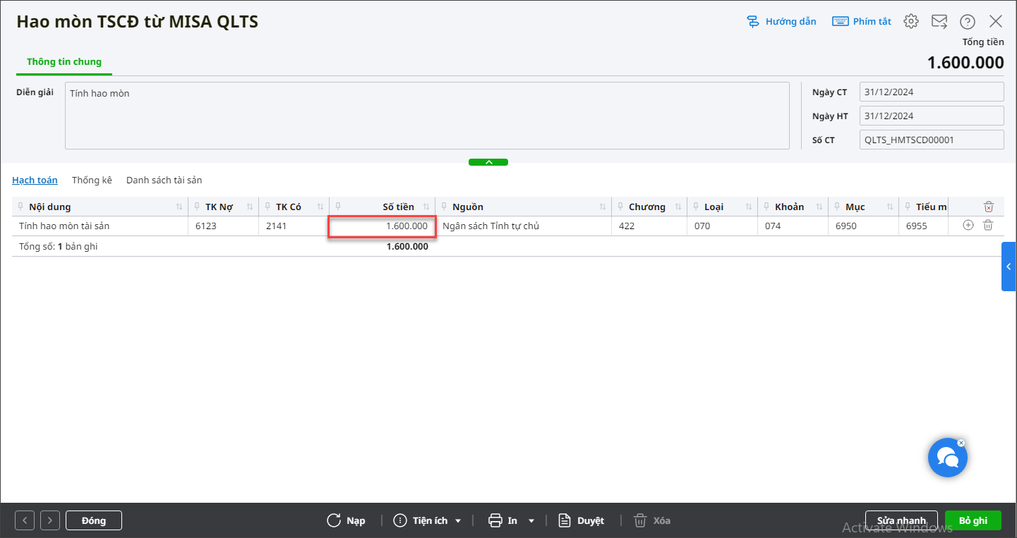 3. Sau đó, mở chứng từ tính hao mòn bên QLTS lên và đối chiếu xem số tiền ở phần mềm nào đang sai và thực hiện sửa lại cho đúng.