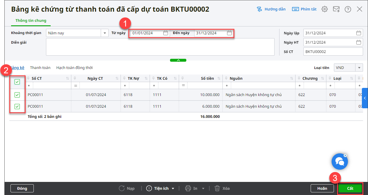 2. Tại tab Bảng kê, tích chọn những chứng từ cần lập bảng kê thanh toán tạm ứng. Nhấn Cất.