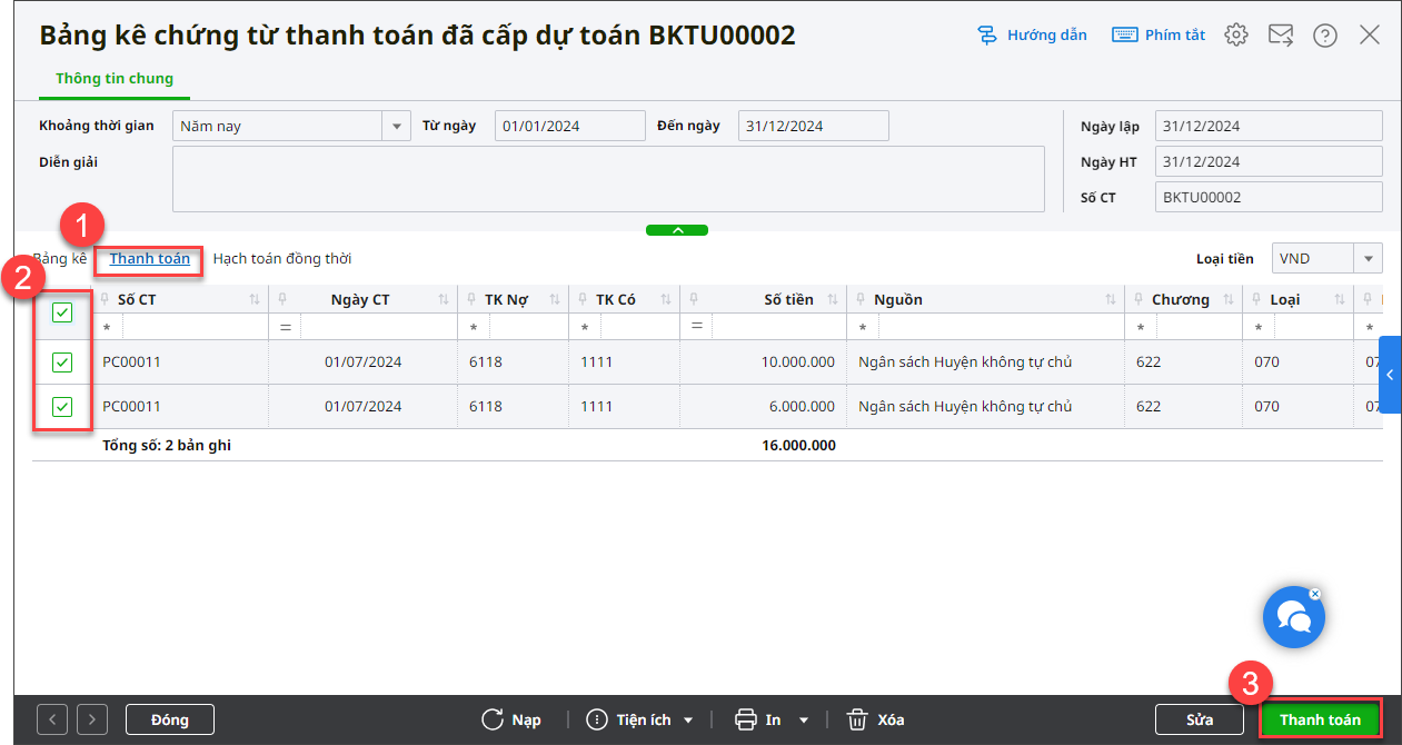 5. Chọn tab Thanh toán, tích chọn các chứng từ cần thanh toán. Nhấn Thanh toán.
