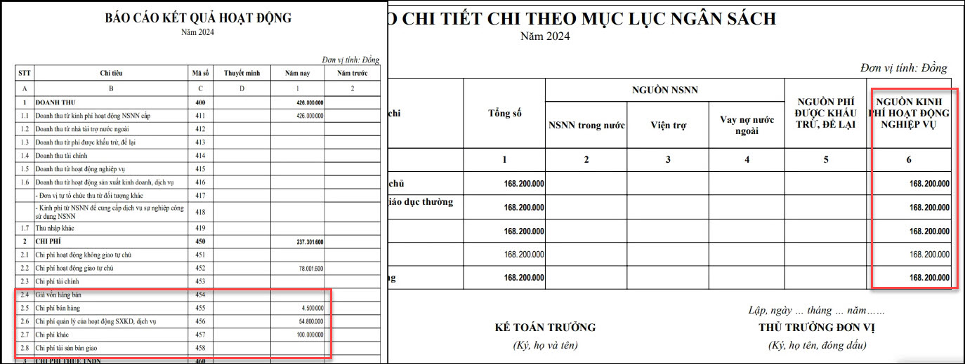 Bài viết này hướng dẫn anh/chị cách xử lý khi xem báo cáo Kết quả hoạt động (B02/BCTC) thấy tổng số tiền ở các chỉ tiêu Chi phí tài chính (Mã số 453) + Giá vốn hàng bán (Mã số 454) + Chi phí bán hàng (Mã số 455) + Chi phí quản lý của hoạt động SXKD, dịch vụ (Mã số 456) + Chi phí khác (Mã số 457) + Chi phí tài sản bàn giao (Mã số 458) lệch với tổng số tiền tại cột 6 – Nguồn kinh phí hoạt động nghiệp vụ trên cho hoạt động SXKD phụ biểu F01-01/BCQT