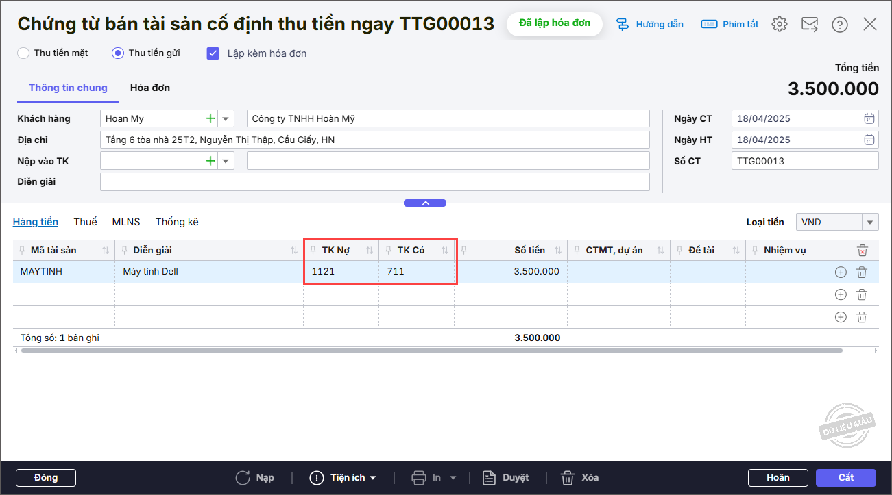 2. Khai báo các thông tin trên Chứng từ bán TSCĐ thu tiền ngay: