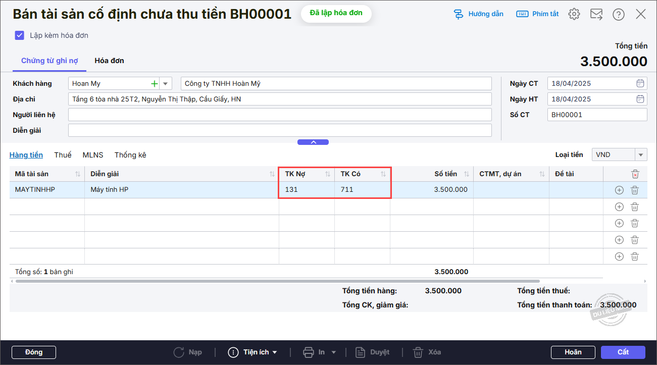 Trường hợp 3: Bán TSCĐ chưa thu tiền