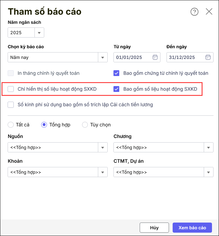 – Hoặc chỉ hiển thị số liệu hoạt động SXKD: Báo cáo sẽ chỉ hiển thị số liệu của Nguồn khác (nguồn viện phí, nguồn thu khác,…)