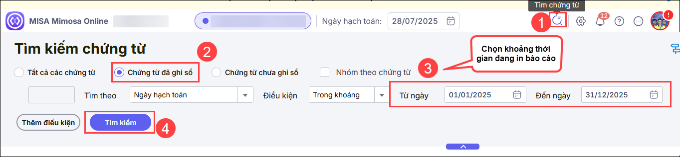 - Anh/chị vào tìm kiếm chứng từ, tích chọn chứng từ đã ghi sổ, chọn thời gian xem báo cáo và tích tìm kiếm