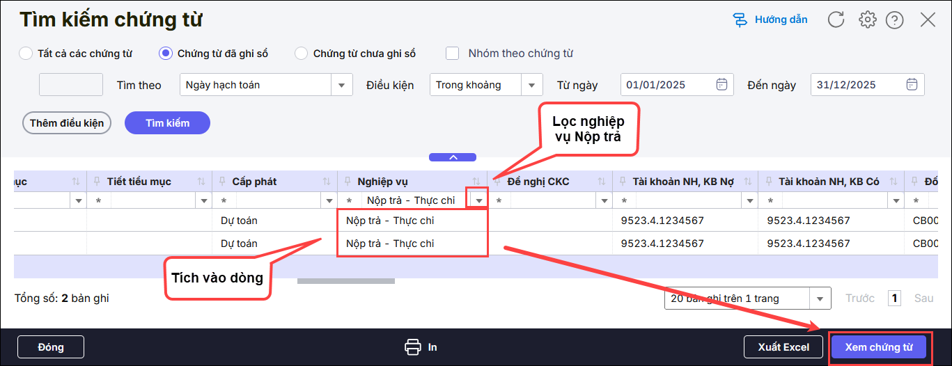 - Lọc chứng từ có cột nghiệp vụ: Nộp trả- thực chi
