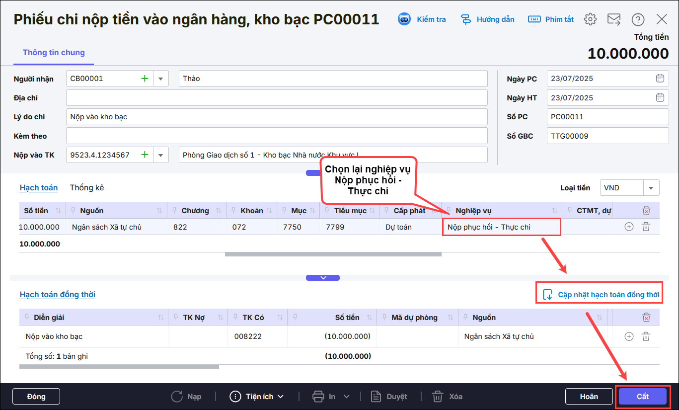 - Kiểm tra lại chứng từ, nếu khoản này bạn nộp lại kho bạc và được rút về sử dụng tiếp thì bạn chọn lại nghiệp vụ là Nộp phục hồi – Thực chi.