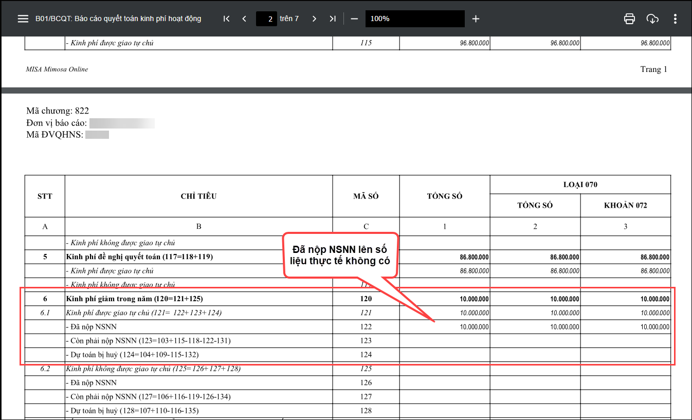Sau đó khi kiểm tra các nguyên nhân trên xong, bạn in lại báo cáo B01/BCQT – Báo cáo quyết toán kinh phí hoạt động.