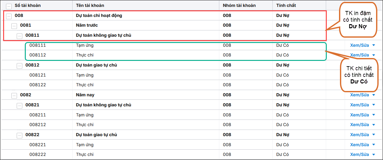 - Các TK 008111, 008112, 008211, 008212, 008221, 008222 tính chất là Dư Có