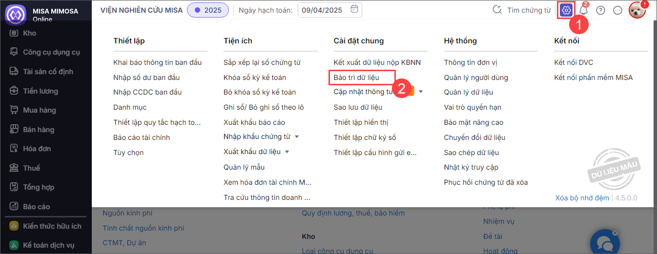Bước 2: Vào Cài đặt chung\Bảo trì dữ liệu.