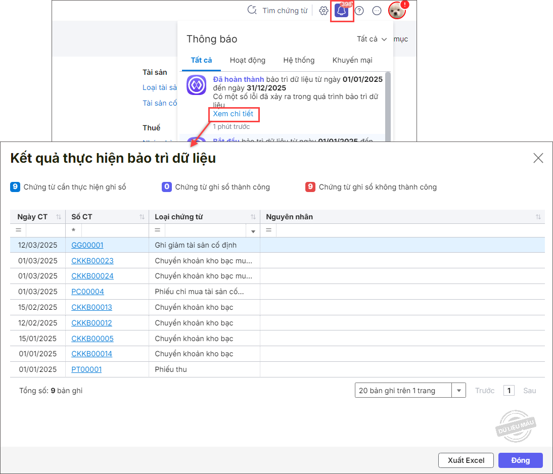 Bước 7: Sau khi bảo trì dữ liệu xong, hệ thống sẽ thông báo Đã hoàn thành tại mục quả chuông. Trường hợp có chứng từ chưa ghi sổ thành công thì anh/chị xem được Kết quả thực hiện bảo trì dữ liệu như sau: