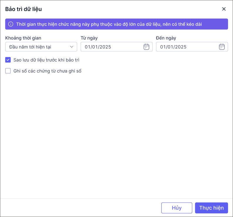 Lưu ý: Thời gian thực hiện chức năng này phụ thuộc vào độ lớn của dữ liệu, nên có thể mất nhiều thời gian nếu dữ liệu nhiều. Để tiết kiệm thời gian có thể chọn khoảng thời gian bảo trì phù hợp với yêu cầu quản lý.
