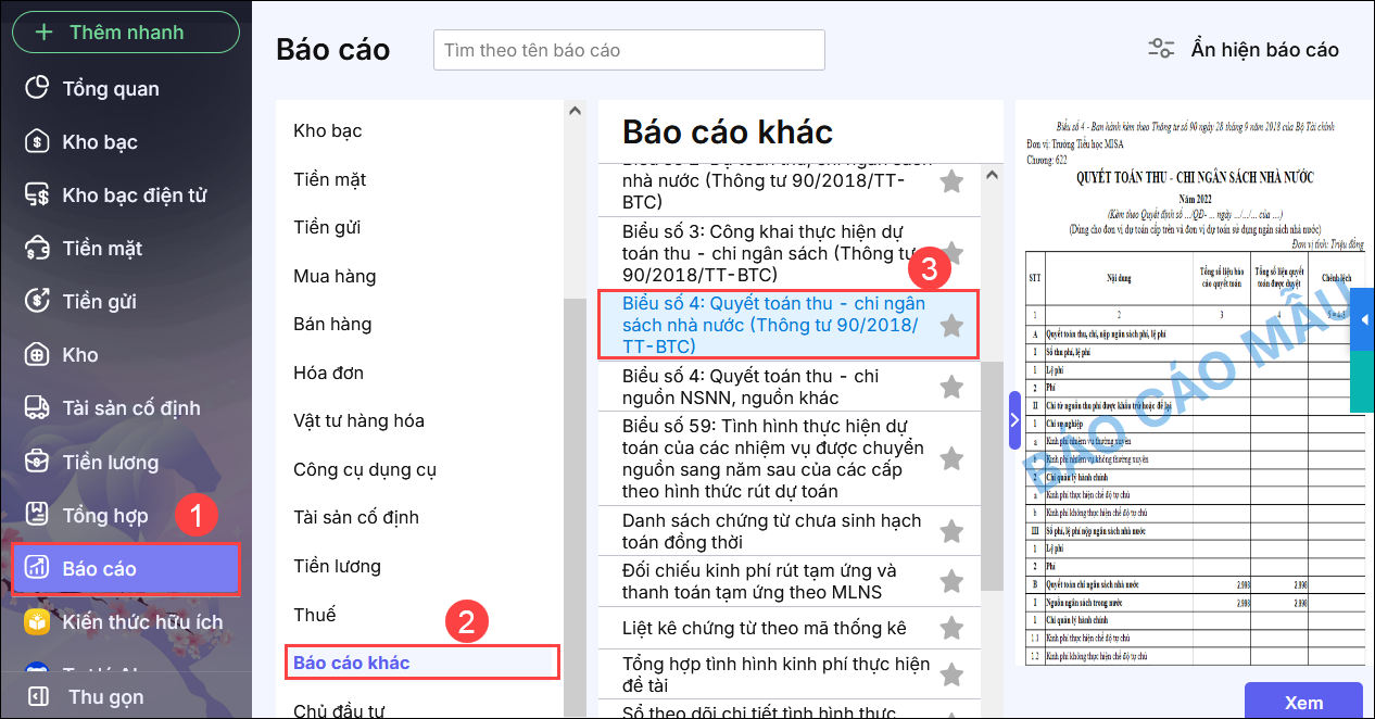 Bước 1: Vào Báo cáo\Báo cáo khác\Biểu số 4: Quyết toán thu – chi ngân sách nhà nước (Thông tư 90/2018/TT-BTC)