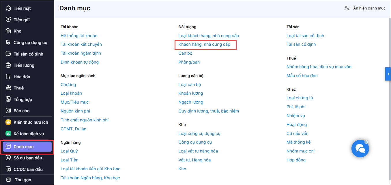 Bước 1: Vào Danh mục, chọn Khách hàng, nhà cung cấp.
