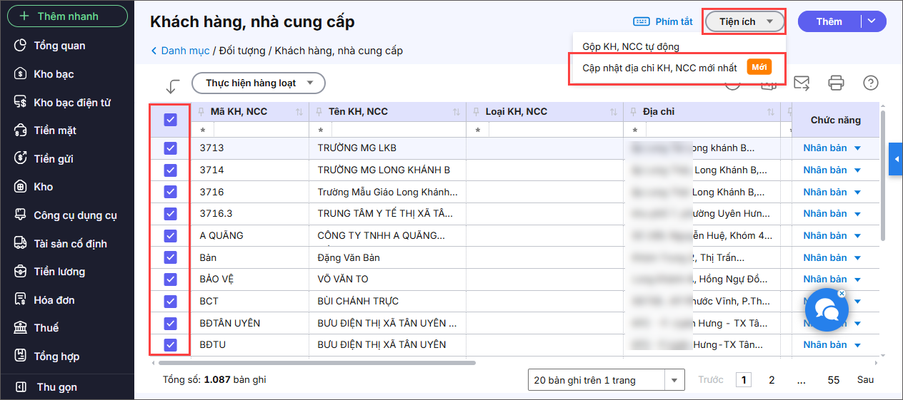 Bước 3: Nhấn Tiện ích, chọn Cập nhật địa chỉ KH, NCC mới nhất.