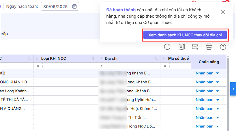 Bước 5: Sau khi hệ thống cập nhật thành công, đơn vị có thể xem danh sách khách hàng, nhà cung cấp thay đổi địa chỉ.