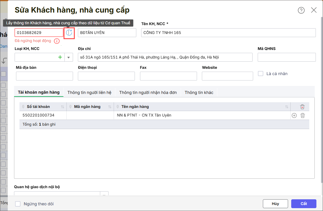 Bước 6: Ngoài ra, khi sửa thông tin Khách hàng, nhà cung cấp, đơn vị có thể nhấn vào biểu tượng ⟳ Cập nhật để lấy thông tin địa chỉ khách hàng, nhà cung cấp theo dữ liệu từ cơ quan Thuế.