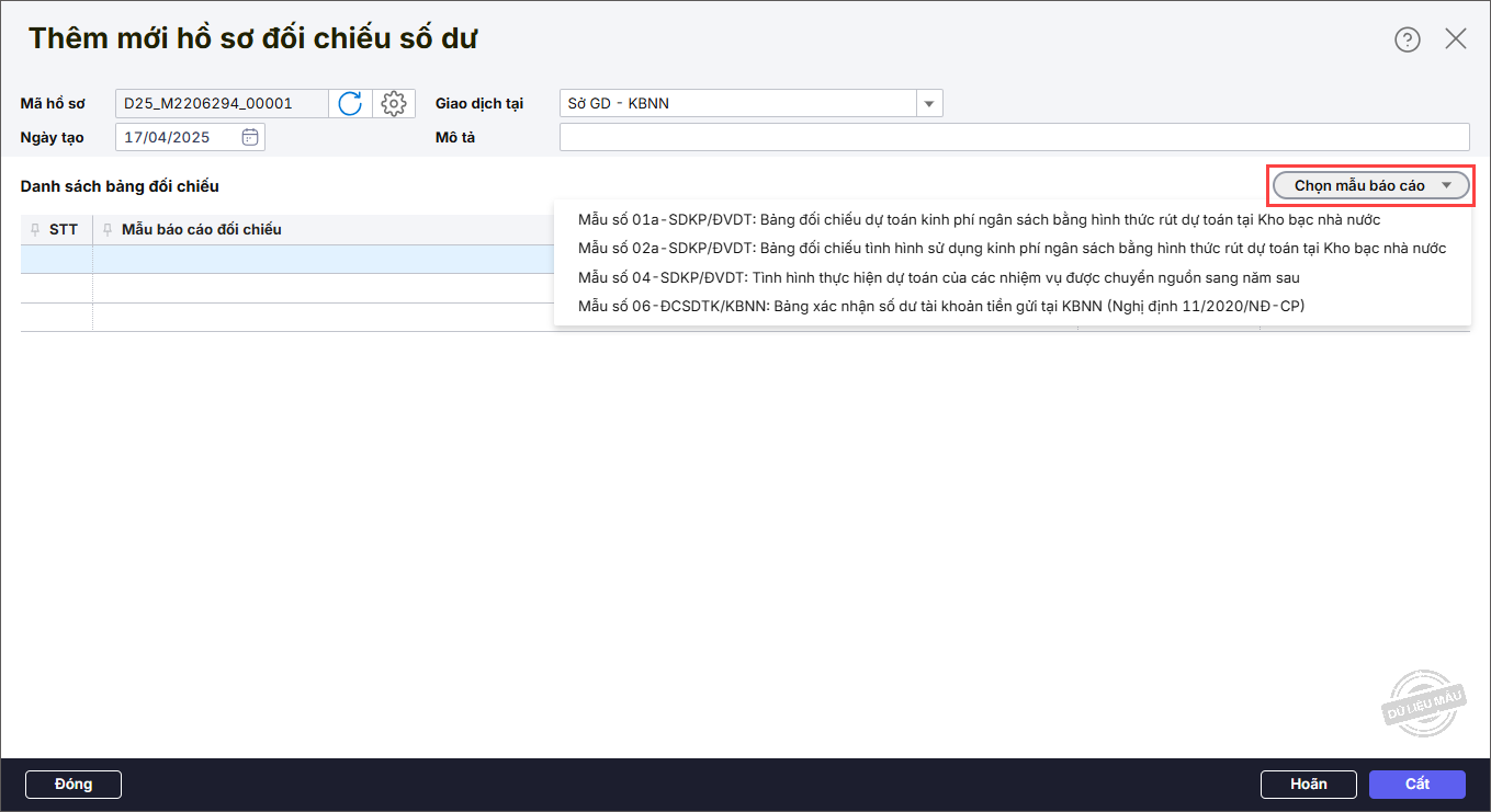 Bước 3: Nhấn Chọn mẫu báo cáo để chọn mẫu báo cáo đối chiếu cần lập. Ví dụ: Chọn Mẫu số 04-SDKP/ĐVDT.