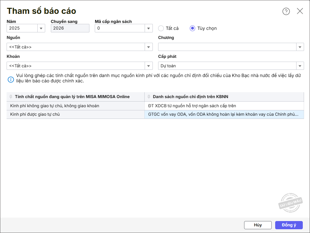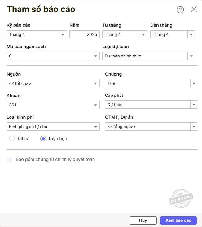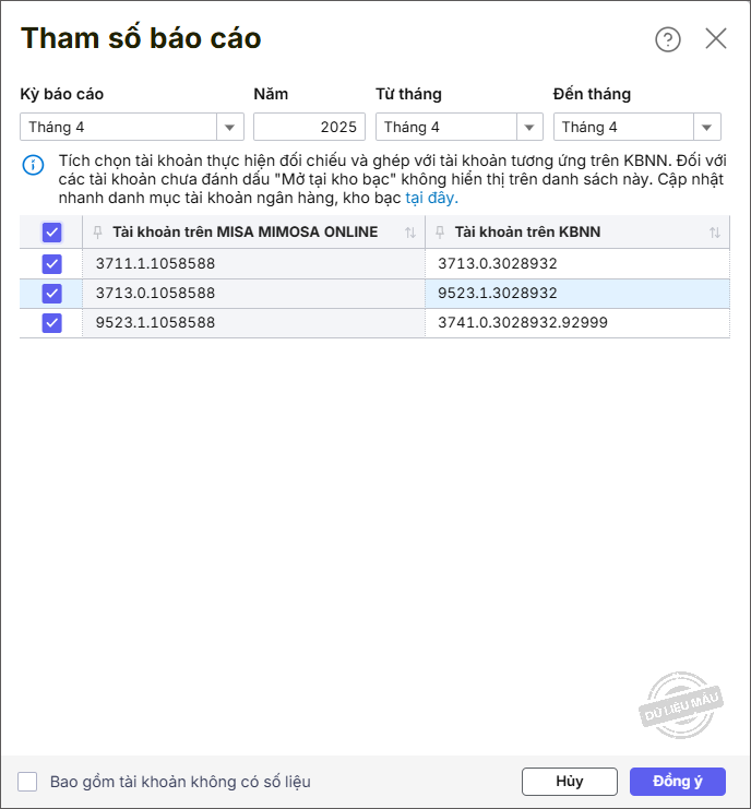 Bước 4: Khai báo các tham số báo cáo và nhấn Đồng ý.
