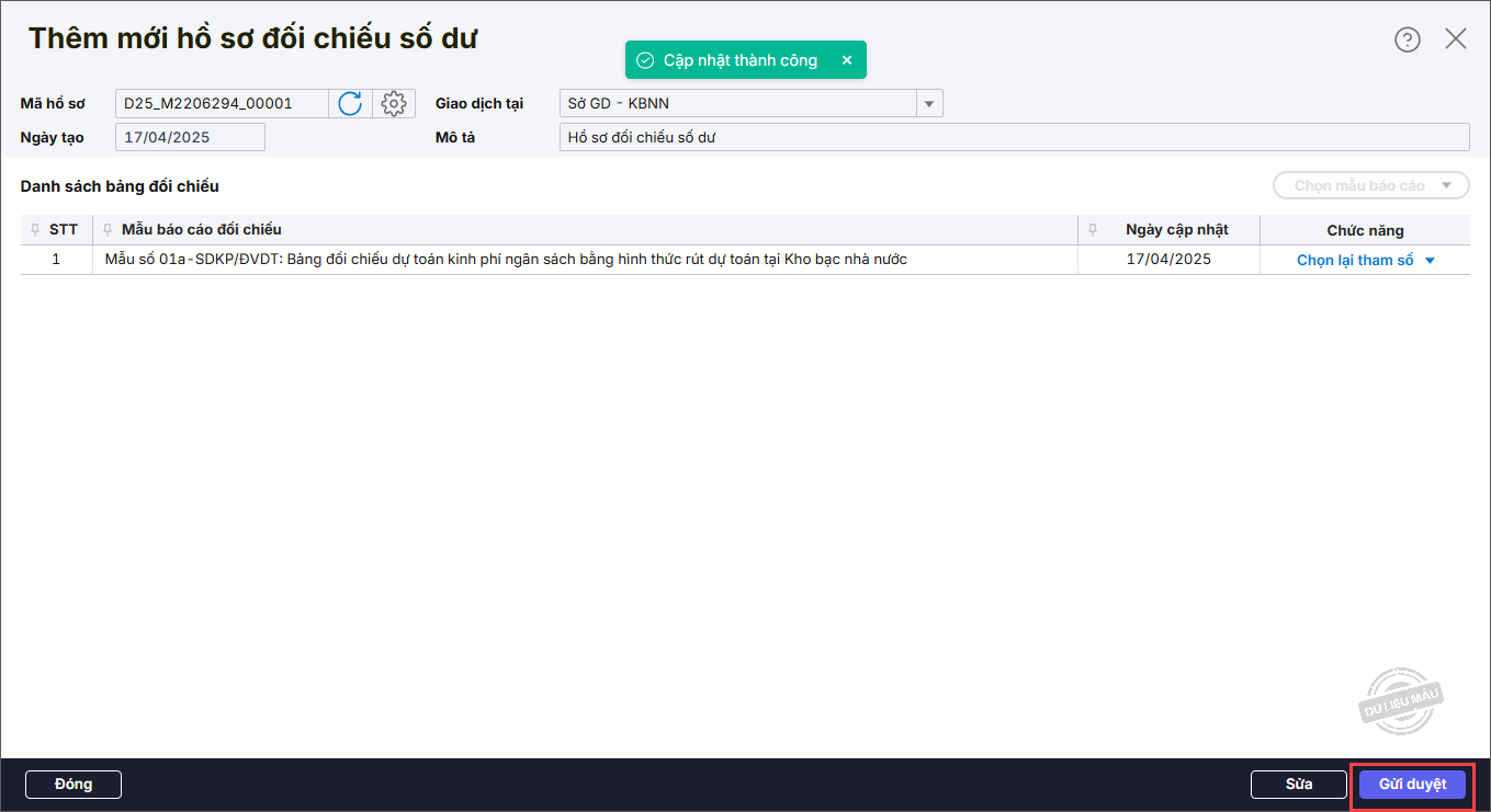 Bước 8: Nhấn Gửi duyệt để gửi hồ sơ cho Kế toán trưởng phê duyệt.
