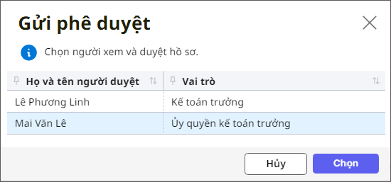 Bước 9: Trường hợp đơn vị có nhiều người phê duyệt như Kế toán trưởng hoặc Ủy quyền kế toán trưởng thì anh/chị cần chọn người duyệt, sau đó nhấn Chọn.