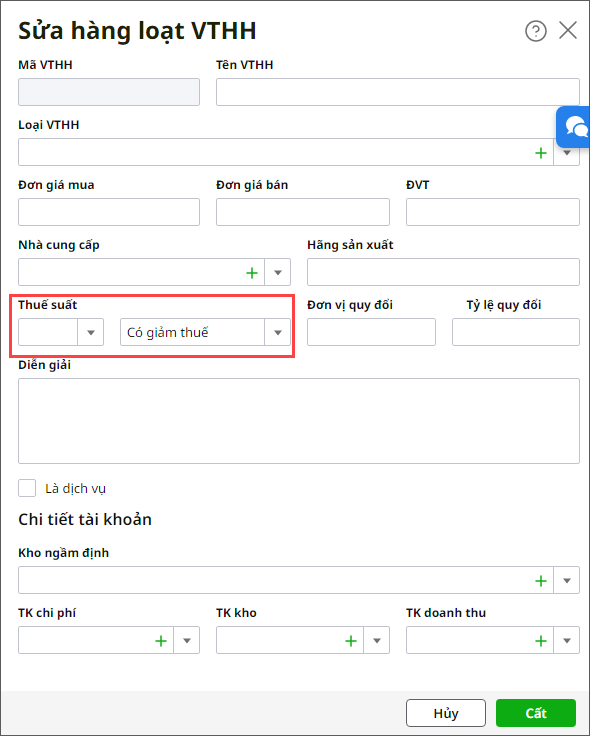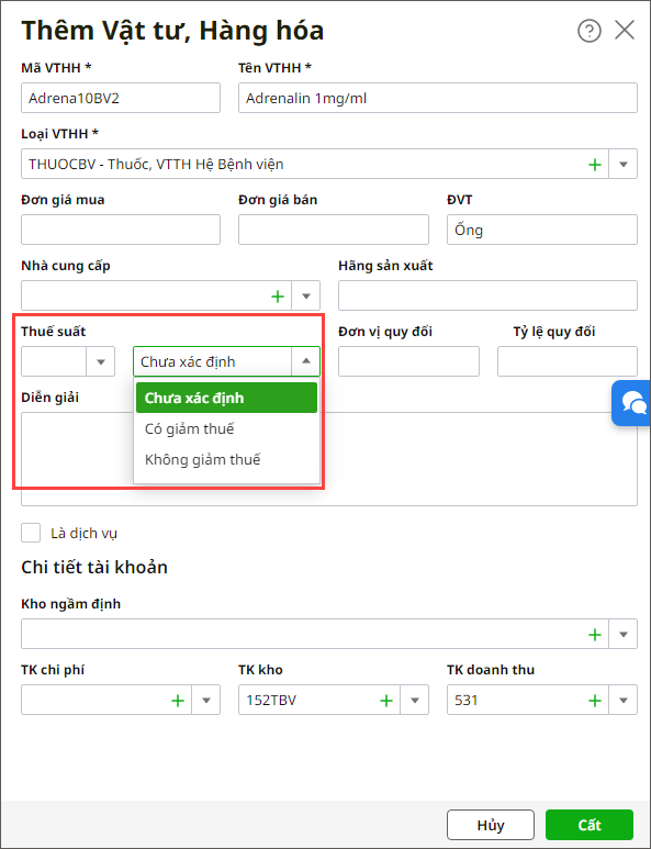 Bước 1: Khi thêm mới danh mục Vật tư hàng hóa, anh/chị có thể lựa chọn Thuế suất theo 3 giá trị: Chưa xác định, Có giảm thuế hoặc Không giảm thuế và chọn thuế suât tương ứng.