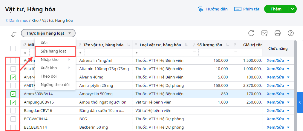 - Nhấn Thực hiện hàng loạt\Sửa hàng loạt.
