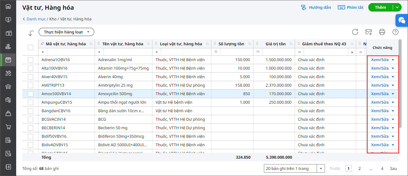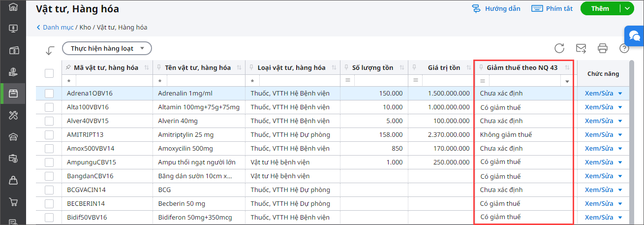 Bước 2: Để cập nhật thuế suất cho từng vật tư hàng hóa đã có thì nhấn Xem/Sửa tại vật tư hàng hóa đó. Rồi chọn lại thuế suất tương ứng.