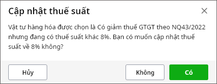 - Nhấn Không: cập nhật thuế suất là Có giảm thuế và giữ nguyên tỷ lệ thuế suất.