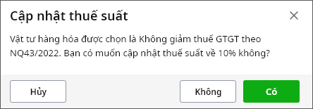 - Nhấn Có: cập nhật thuế suất là Không giảm thuế và tỷ lệ thuế suất là 10%.