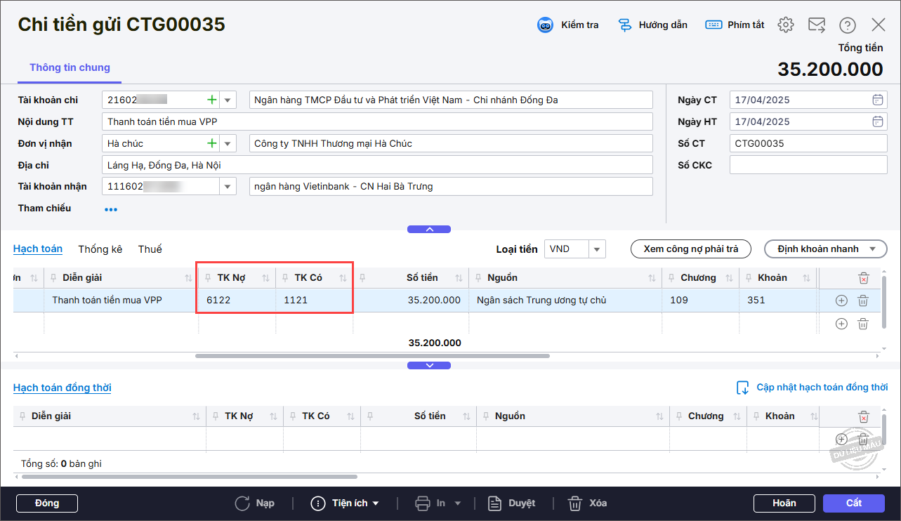 - Tài khoản chi: lựa chọn hoặc khai báo thêm tài khoản ngân hàng, kho bạc chi tiền.