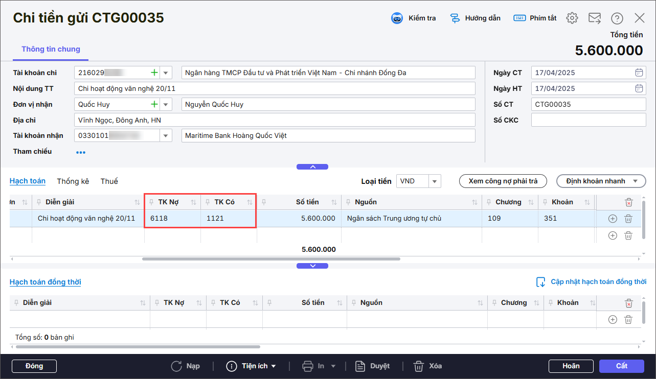 Bài viết hướng dẫn hạch toán, quản lý và theo dõi các khoản chi khác bằng tiền gửi (chi khen thưởng, nộp thuế,quỹ, chênh lệch tỷ giá……) nhanh chóng và chính xác.Qua đó ghi nhận đầy đủ chứng từ chi tiền gửi,đảm bảo số liệu khớp với sổ tiền gửi và phục vụ tốt cho công tác đối chiếu, báo cáo tài chính.