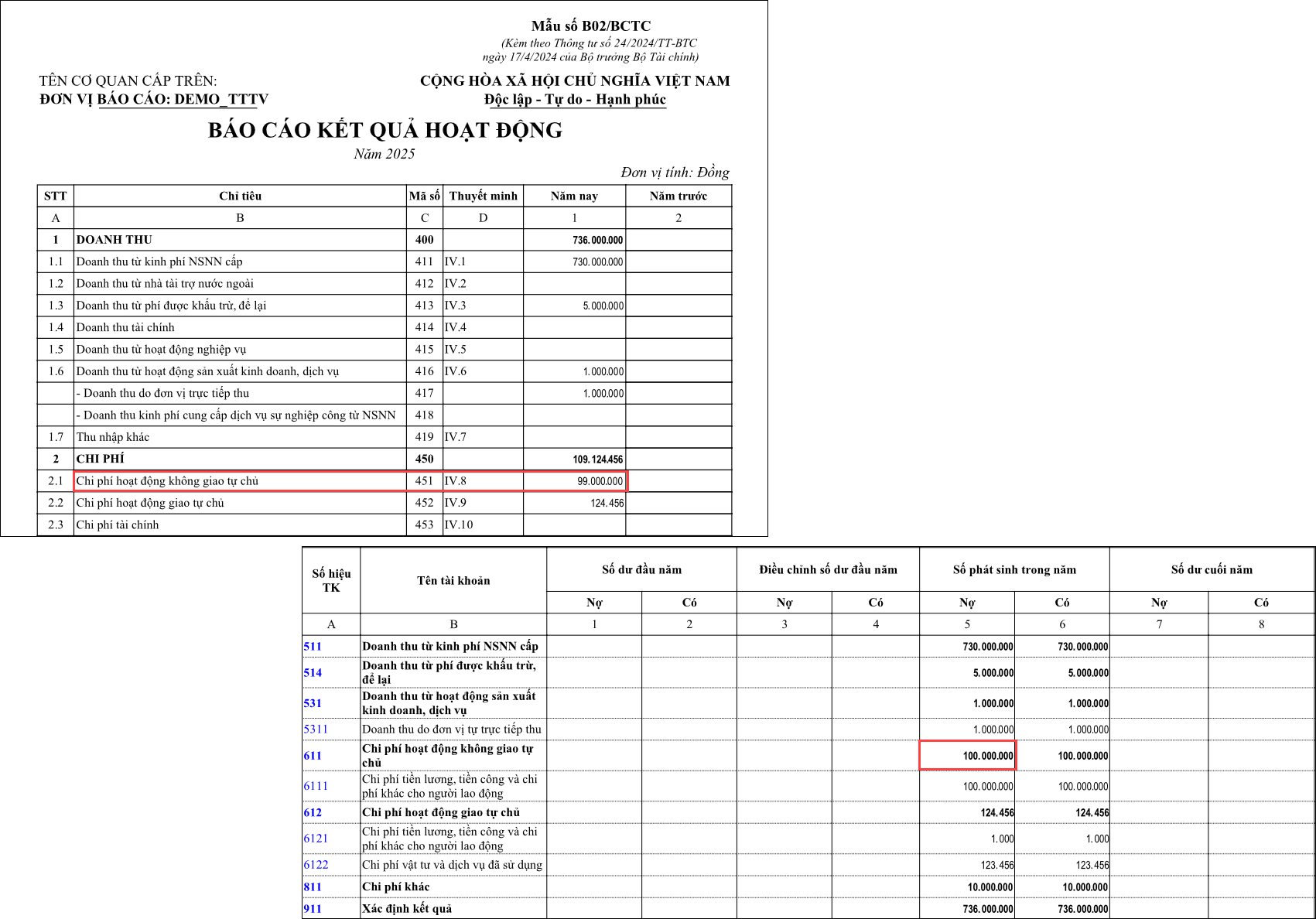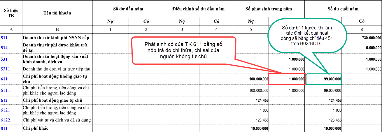 – Căn cứ lấy số liệu chỉ tiêu Chi phí hoạt động không giao tự chủ (Mã số 451) trên B02/BCTC là tổng số phát sinh bên Có TK 611 đối ứng với bên Nợ TK 911 (Bút toán xác định kết quả hoạt động trên phần mềm).