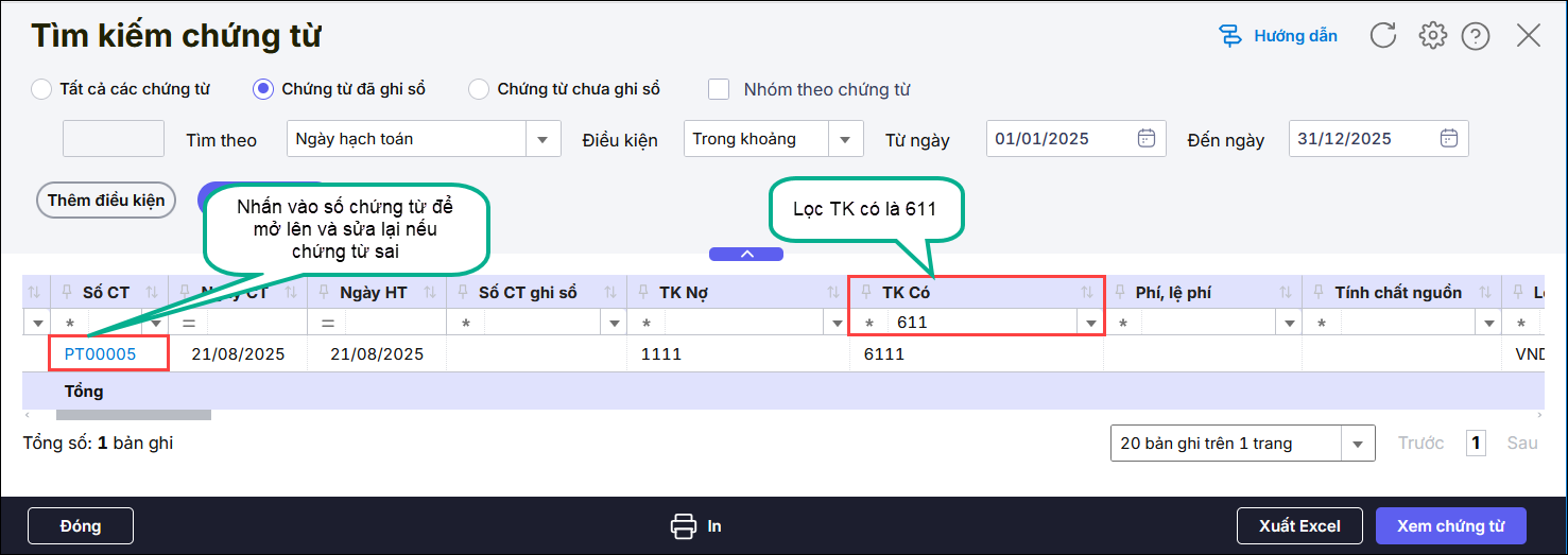 ♦ Nếu số phát sinh Có không đúng với thực tế phát sinh nghiệp vụ giảm chi phí do thu hồi, nộp trả số đã ghi thì anh/chị vào tìm kiếm chứng từ giảm chi phí và kiểm tra lại theo hướng dẫn tại đây, lọc tài khoản có 611, tài khoản nợ khác 911. Nhấn vào số chứng từ để mở chứng từ sai lên rồi thực hiện sửa lại nếu sai, bỏ nếu thừa, thiếu thì bổ sung.
