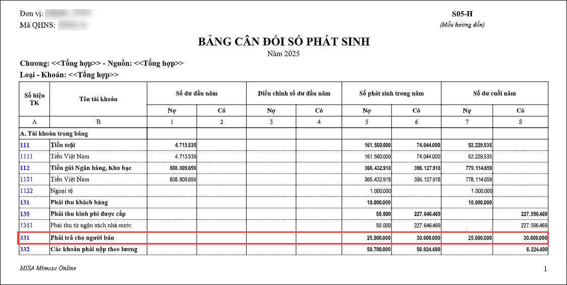 3.1 Tổng chỉ tiêu mã số 133 + mã số 182 không bằng số dư Nợ TK 331 trên Bảng cân đối số phát sinh (S05-H) do xem mẫu hướng dẫn