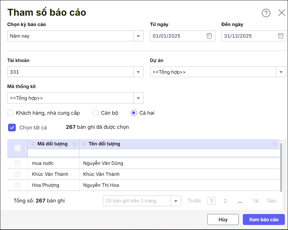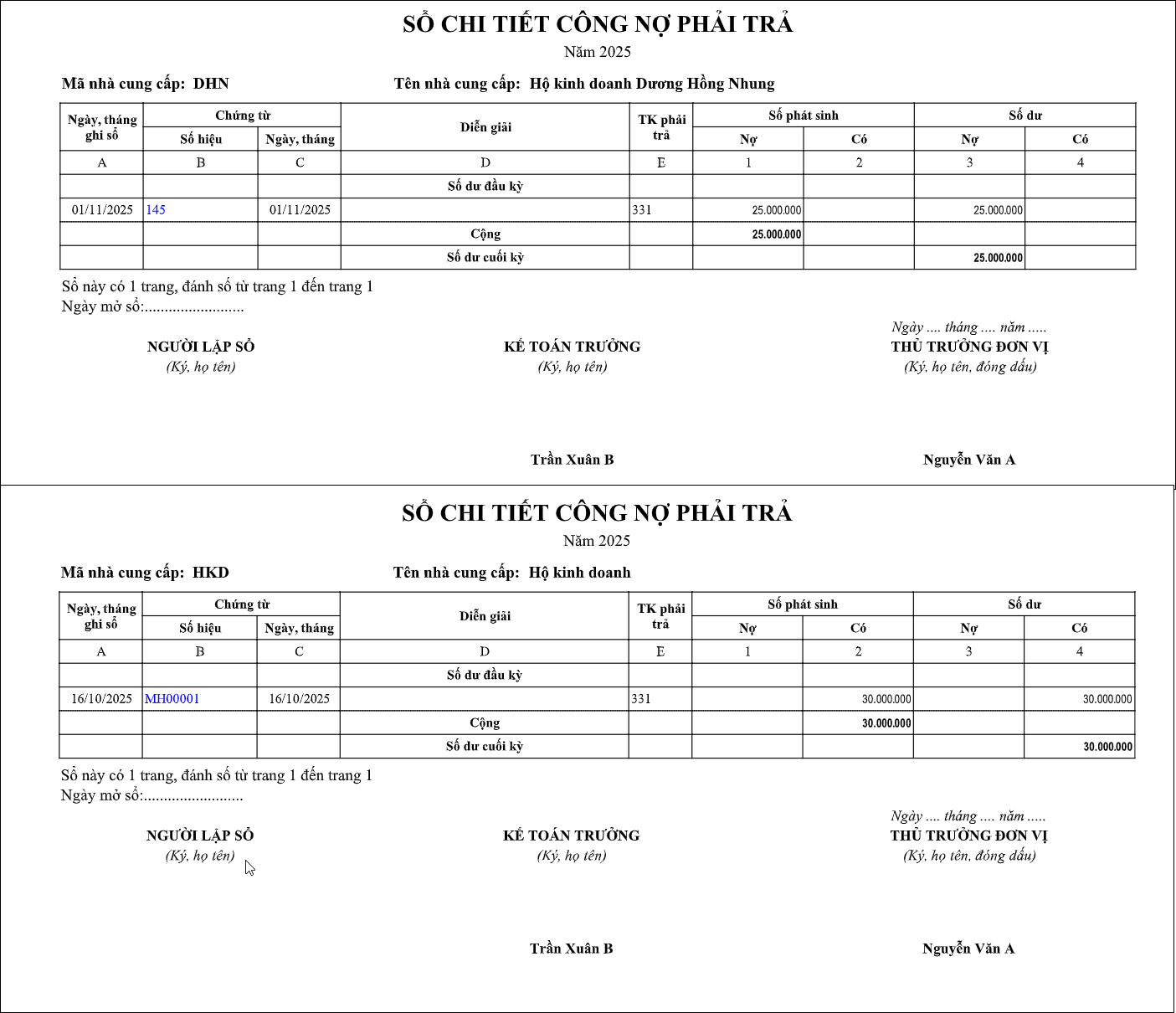 - Báo cáo sẽ thể hiện đối tượng bên Nợ và đối tượng bên Có đã chọn trên chứng từ hạch toán.