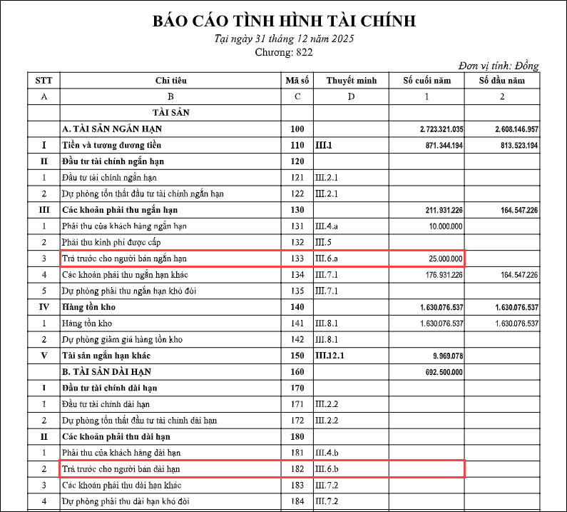 Bước 3: Kiểm tra số dư Nợ TK 331 sẽ bằng với tổng 2 chỉ tiêu Trả trước cho người bán ngắn hạn (mã số 133) và chỉ tiêu Trả trước cho người bán dài hạn (mã số 182) trên báo cáo B01/BCTC: Báo cáo tình hình tài chính.