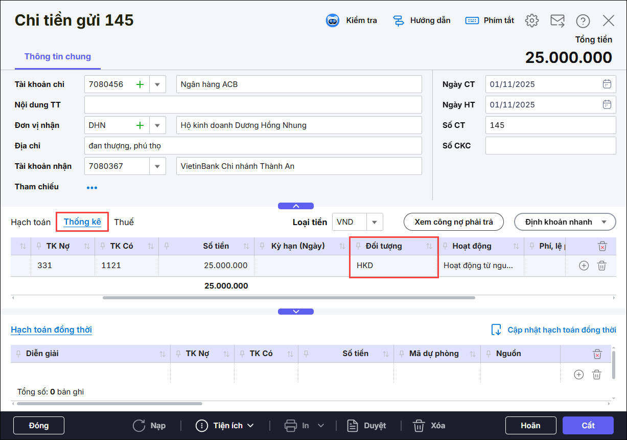 Ví dụ: Khi mua hàng đang chọn đối tượng: HKD, thì khi thanh toán cần phải chọn ở Tab Thống kê cũng đối tượng: HKD. Như vậy, cần sửa lại chứng từ thanh toán trả tiền cho nhà cung cấp: