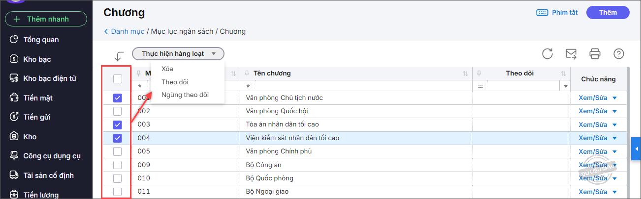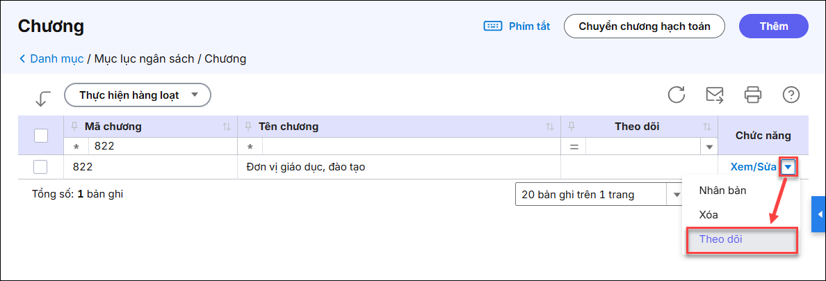 - Nếu Chương đã có nhưng trên chứng từ không hiện ra để chọn thì chọn Theo dõi.