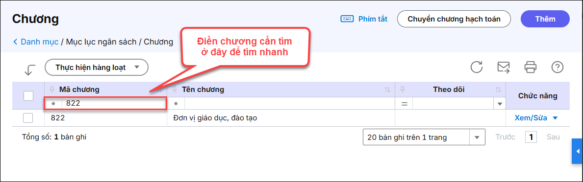 Lưu ý: Nếu tìm kiếm ở bước 2 không thấy Chương cần tìm, anh/chị nhấn Thêm để Chương chưa có. Hoặc nhấn vào hình mũi tên tại dòng chương tương tự tên, mã chọn Nhân bản để Thêm nhanh chương tương tự.