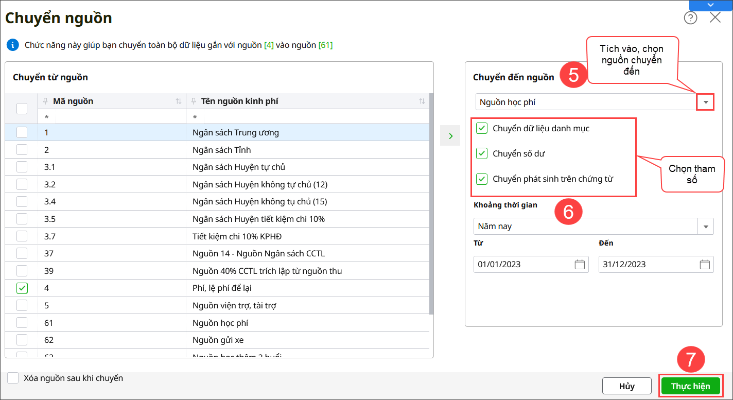 Ví dụ: Chuyển toàn bộ số dư và chứng từ phát sinh từ nguồn Phí, lệ phí để lại sang nguồn Học phí