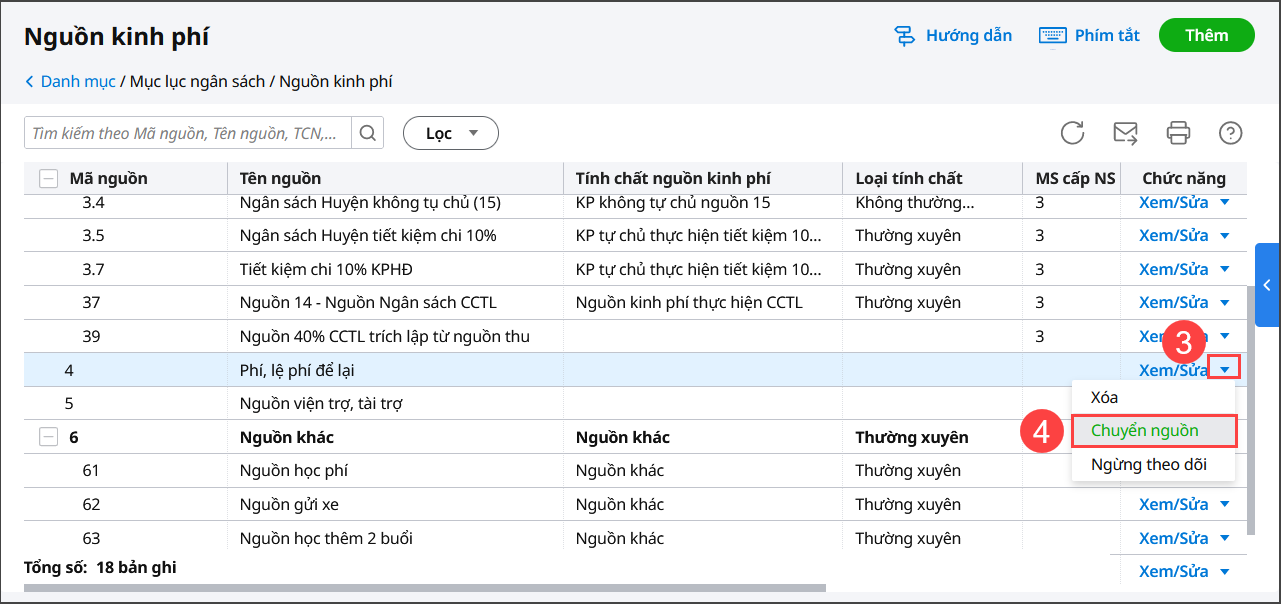 Bước 3: Nhấn chuột vào hình mũi tên tại dòng nguồn kinh phí cần chuyển đi trên danh sách, chọn chức năng Chuyển nguồn.