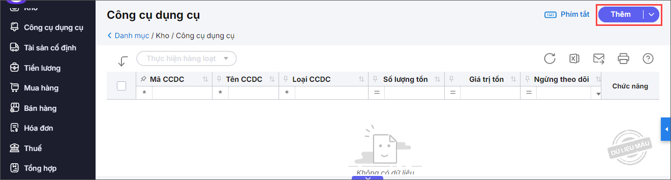 Bước 2: Để thêm mới công cụ dụng cụ, nhấn Thêm.
