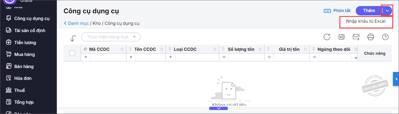 Trong trường hợp nếu bạn không muốn thêm thủ công từng mã CCDC thì có thể nhập khẩu hàng loạt danh mục CCDC từ file Excel như sau: