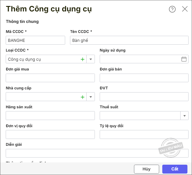 - Tên CCDC: Tên của công cụ dụng cụ.