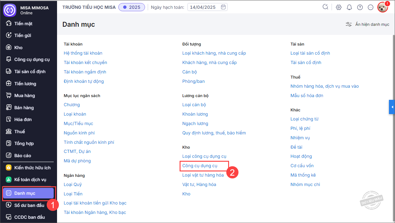Bước 1: Chọn menu Danh mục\Công cụ dụng cụ.