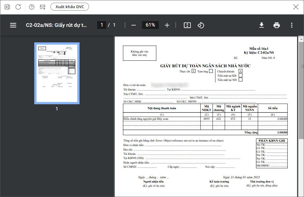 Bước 4: Trường hợp sửa chữa lớn TSCĐ bằng nguồn NSNN thì kế toán phải lập giấy rút dự toán để đi kho bạc thanh toán cho nhà cung cấp: