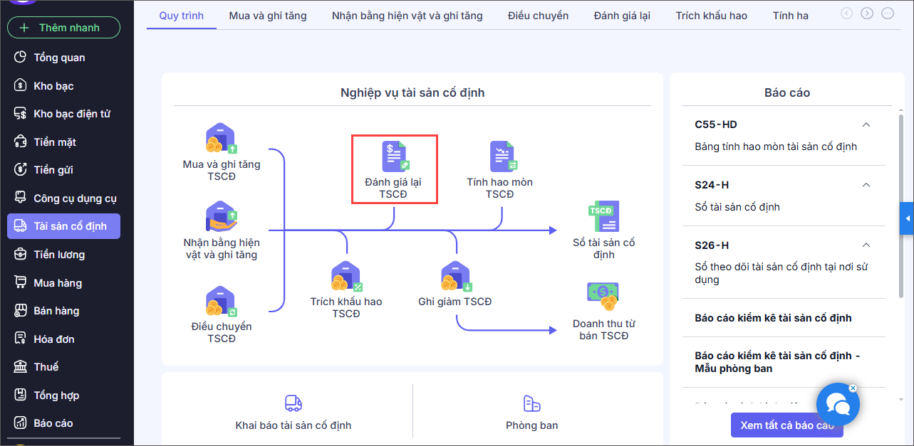 Bước 1: Vào menu Tài sản cố định\Quy trình\Đánh giá lại TSCĐ, chọn Đánh giá lại tài sản cố định.