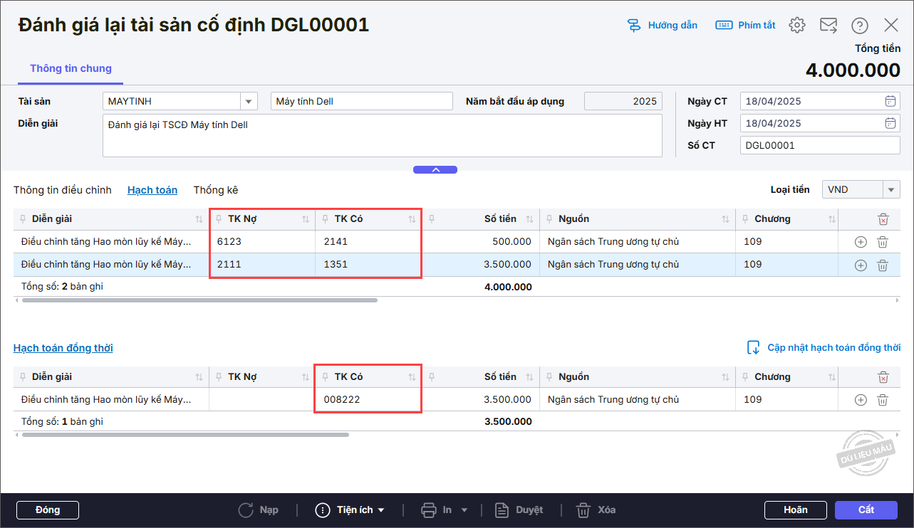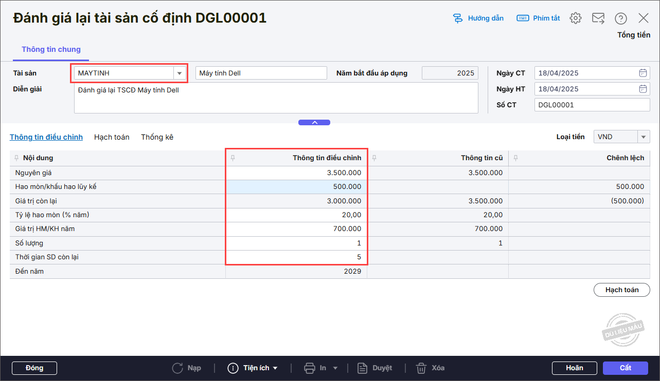 Bước 2: Khai báo thông tin chứng từ Đánh giá lại tài sản cố định.