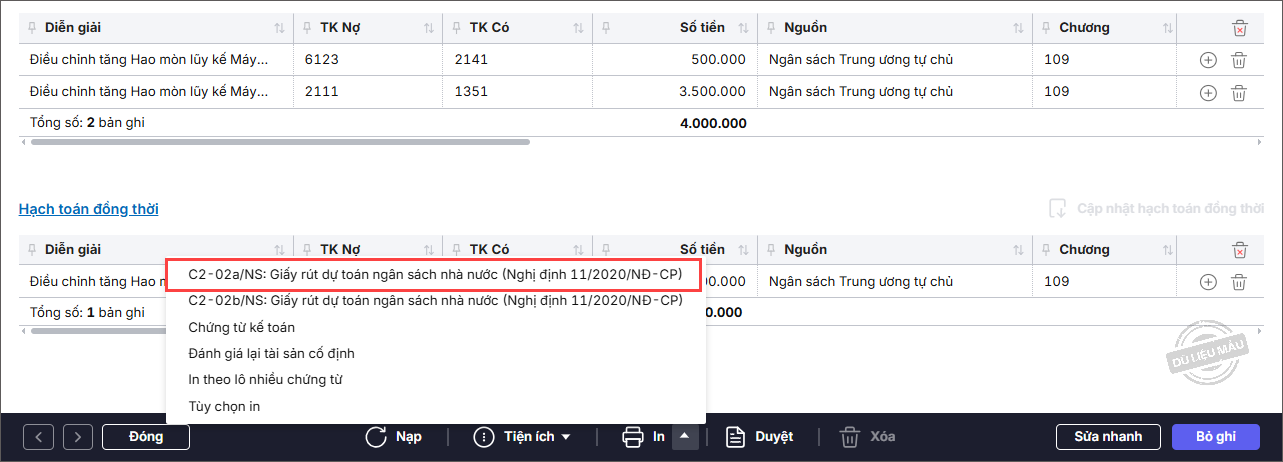 - Trên chứng từ đánh giá lại, nhấn In, chọn in mẫu C2-02a/NS hoặc C2-02b/NS: Giấy rút dự toán ngân sách (Nghị định 11/2022/NĐ-CP).